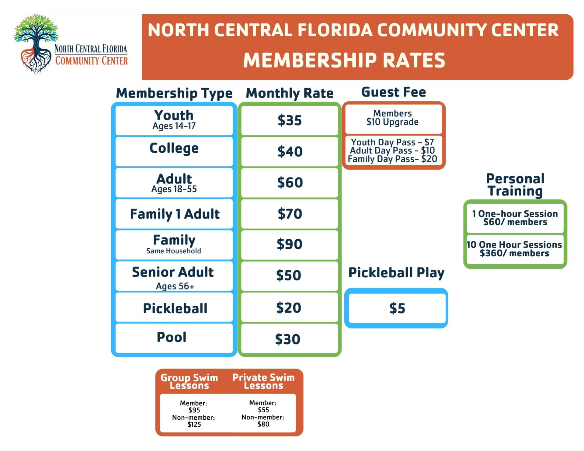Employees are a company’s most valuable assets. Employees involved in health and wellness programs are more creative and productive. The NCFCC provides a full range of health and wellness programs and services that can help your employees look and feel their best. For more information on the Corporate Program, call 352.374.9622!